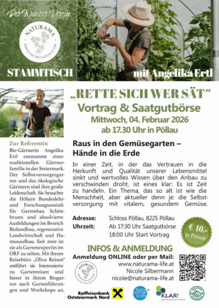 Am Mittwoch, dem 4. Februar 2026, lädt der Verein Naturama gemeinsam mit der KLAR! Naturpark Pöllauer Tal zum Vortrag „Rette sich wer sät“ mit Bio-Gärtnerin Angelika Ertl in das Schloss Pöllau ein.